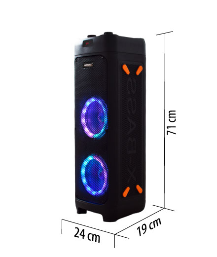 Este espectacular parlante con conexión Bluetooth, te permite reproducir música a través de tarjeta SD o USB, cuenta con salida Auxiliar y Radio FM, además incluye un micrófono alámbrico para hacer karaoke o perifoneo, ideal para negocios, posibilidad de adaptar en una base o trípode.